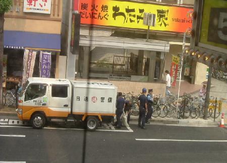 飲茶食べ放題でご満悦の後重たくなったおなかをかかえながら怪談を降りていきます。途中で外を見たミセス・カモカが騒ぎ出しました。ちょっとぉ、あれ、何? 何?窓の外に目をやると、何やらものものしい雰囲気です。うむ。銀行強盗か? いや、あれは、店の売上金か何かをつめた袋を車に積んでいるんだわ、きっと。白いドンゴロスの袋はずっしり重たそう。中には札束が・・・さらにミセス・ドンゴロスは騒ぎます。白昼現金輸送車を襲わんかの勢い。私は必死の思いでとめました。村一番の大金持ち、現金には困らない茶比姫のあたし。欲しいんならあたしのスイッツァランドの預金口座からおろして分けたるからがまんしとき。つかまってそのぶちゃいくなお顔全国放送されたらどうするの。かわいい孫ちゃんのためにがまんし。なんとか説得してことなきを得ました。いや、しかし、あれ、全部1円玉やったらどついたるわ。ね、カモカ師匠。