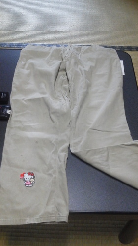 幻泉館主人さんの日記「あなあきすと」を読んでいて思い出しました。私も長いこと履いてよれよれになって、生地も弱くなったパンツがあるのです。洗濯してもしみももうとれないの。とうとうすれて穴があいたので、畑仕事用におろしたのですが、2年前位かな。村の洋品店でキティちゃんのアップリケを見つけたので、その穴のところに縫い付けてみました。なんかいい感じ。結局また普段に履くことになりました。でも、洗濯は手洗いね。もしぽろりととれたらいけないし。いつもキティちゃんと一緒にいる感じです。