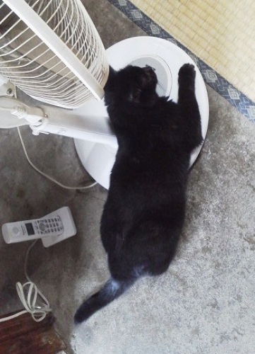 にゃんこさんというのは、だいたい一番気持ちのいい場所に陣取るといいます。最近のちびさんは、よく扇風機に抱きついています。どちらかというと、扇風機は風にあたったほうが気持ちいいと思うのですがね。