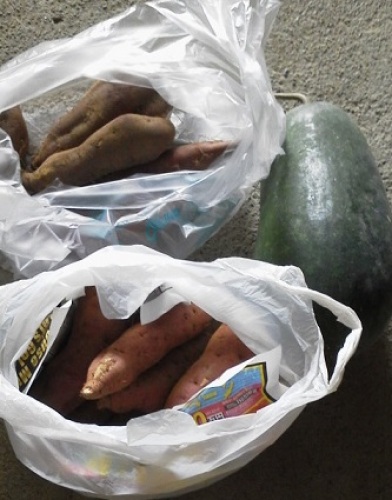ご近所からのいただきもの、というかお返しです。さつまいもと冬瓜。さつまいもは今旬で、あちこちの畑でできています。うちで作ってないものをいただくとうれしいですわ。うちからは、ごーやや伏見とうがらしなどをさしあげました。いちじくもたくさんできたからけっこうあげましたね。ぶつぶつ交換みたいやね。そうそう、夕方うんだばかりという卵もいただきました。別のおばちゃんからは冬瓜をいただきました。何あげたんだったっけ?いただいたらお返ししたらまたそのお返しがきたり。楽しいですわ。さつまいもは寒さに弱いので、ちょっと手間だけど、一個一個新聞紙にくるんで発泡スチロールの箱に入れて暖かいところに置いておきます。こうしておくと冬までもてるのよ。まあ、じきに食べてしまいますけどね。