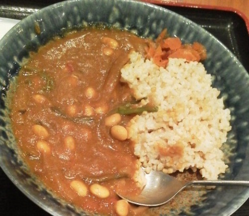 お祭りやらダンスやらライブがあったので伊丹のお話が後回しになってしまいました。もう10日も前になってしまいましたが、伊丹でプチイベントがあり、フィドルをかかえておっちら行ってきました。茶比村から約2時間半、道中長いので、まずはミナミでちょこっと小腹のごきげんをとることに。お気に入りのオーガニックのお店です。大豆と山菜のカレー。ごはんはもちろん玄米100%です。辛いのが苦手な私にもたべやすい辛さでした。こないだは玄米のおにぎりと野菜たっぷりのスープをいただいたのね。ヘルシーな満腹定食小腹がごきげんになったところで伊丹に向かいます。