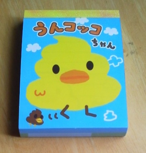 ペコちゃんの文房具を買った後で、メモ張コーナーをぶらぶらしているとなんだかかわいいのを見つけてしまいました。ちゃんとメモ用紙一枚一枚にうんコッコちゃんがいます。これは買いだな。そういえば、のんびり県に似た名前のおいしいものがありました。