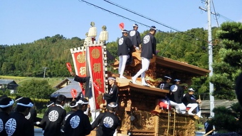 お祭りが始まりました。天気が良くて気持ちいい。茶比亭の横の道を行きます。道の幅も狭いし、横は川なのでゆっくり行かないとあぶないの。スーパーやクリーニング店がある大きな道路では走るのよ。大工方と呼ばれるおにぃさんが走っている地車のてっぺんで飛び跳ねます。祭りの花形やね。たまに落ちて骨折したりするおにぃさんもいてます。最近、茶比村近辺の6つの村の地車が集まって(各町に1台地車があります)それぞれやりまわしや速攻ダッシュを競って披露するので、スーパー付近の交差点は大賑わいです。茶比村のちびっこたちによると、うちの村のが一番迫力あってかっこいいということです。たまらず、スーパーの惣菜コーナーのおばちゃんも見に出てきます。夜はまた提灯がともってきれいなんですよ。明日も朝から晩までお祭りです。でも私は、明日はダンスの練習と、その後ライブに行ってきます。日付変更線を越えないように帰ってこよう、とは思ってますが・・・。どなた様の楽しい週末をおすごしください。