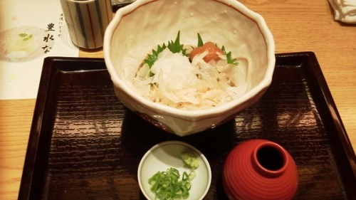 ダンスの練習の後、仲良しの餡ちゃんとミナミへ。その夜はライブがあったのですが、始まるまで少し時間があるので、軽くディナーにしようということになり、南の島のあのお方の大好きな百貨店に行きました。7,8,9階がダイニングメゾンとして35のレストランがあります。とりあえず、近いところで、お蕎麦屋さんにはいりました。梅おろしそば。冷たいお蕎麦に大根おろしと花かつおがたっぷり。特大の梅干しがどかんと一個のぞいてます。それにおつゆをおしみなくぶっかけていただきました。う~ん。挽きたて、打ち立て、ゆでたての蕎麦はうまい。このお店はそばしゃぶがいただけるのよ。そば湯。そば湯って、普通もっと白くにごっているけど、すんでいてあっさりでした。私はそば湯は何もいれずに、そば湯だけ飲むのが好きなのです。さて、少しおなかも落ち着いたところで、地下鉄でひと駅、ライブ会場へ向かいましょう。