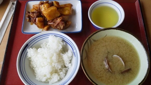 日曜日、すっとこさんが大幅に朝寝坊したので朝ごはんがすっかり遅くなりました。もう11時まわっています。たまには外で食べるのもいいか、と、近くの食堂で朝昼兼用の食事となりました。自分で好きなものを選んでレジで代金を払ってテーブルにつくというところです。私は、からあげとポテトの甘酢和えにあさり汁。しっかりあさりのだしが出ていて、おいしかったです。朝マックも好きだけどね。