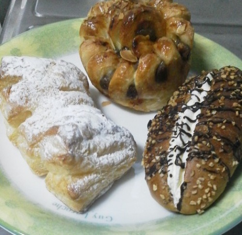 おやつは何がいいかな、と思っていたら、ちょうど目の前にパン屋さんがあって、久しぶりにパンもいいなあ、と入ってみました。できたてのパンがてんこ盛り。栗がたっぷりのデニッシュ、クリームチーズとサワークリーム入りのデニッシュ、カプチーノ生地のパンにホイップクリームがたっぷりのパン。アーモンドとチョコレートクリームをかけて。どれかひとつに決めるなんて無理です。ささ、英気を養ったら、また練習がんばりましょ。