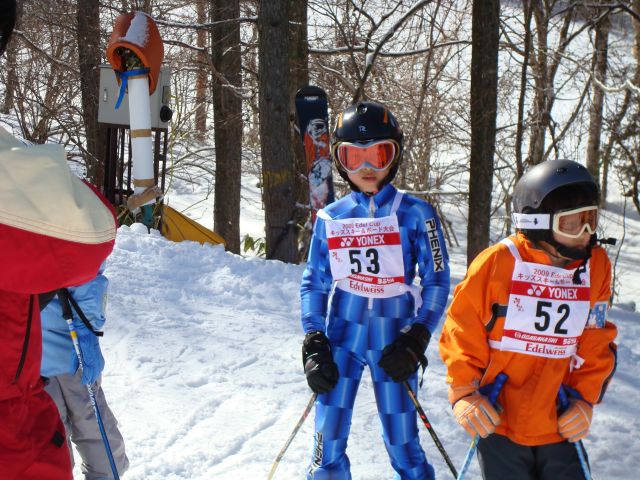 例年、お正月早々に行われていたエーデルワイスのキッズ大会が、雪不足を懸念してか今年は2月末になっていた。お正月だと引っ越しのバタバタで「参加できないな」と思っていたのだが、2月になったので何とか参加できることになったが、さすがに小3ともなると、地元の子ども達はバリバリのレーサーになるので、滑走日数の少ない息子は勝ち目がないが、親も参加してのエキシビジョンもある(これが目的という話も!(笑))ので、とりあえず参加。昨年は1本目でDNFしてしまったので今年はどうかと思ったが、なんとか2本無事に滑ることができた。でも、トップとは10秒以上話される始末・・・。ま、今シーズン2回目のスキーですからね! 格好はいっちょまえですが、滑りは伴いません!(爆)でも、早い選手の滑りを見て、マネをするようにはなってきました。 今年から参加賞がなく、参加者全員に順位ごとに賞品がもらえ、12人中9位でも、賞品が出たことにご満悦で帰宅です。