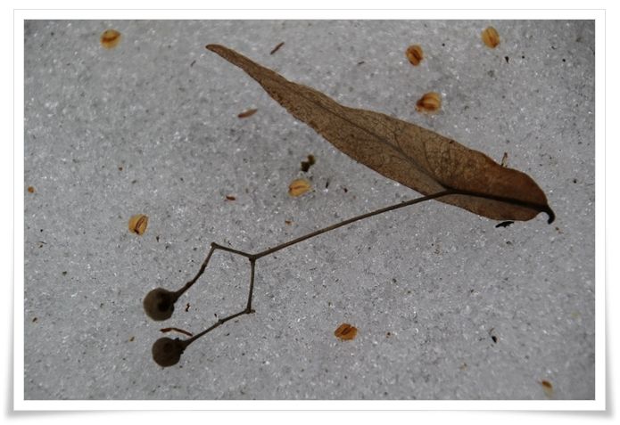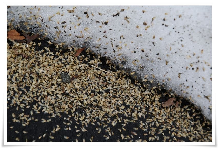 にはみ出した残雪とアスファルトの辺りにこんな細かいモノがいっぱい落ちていましたよ~