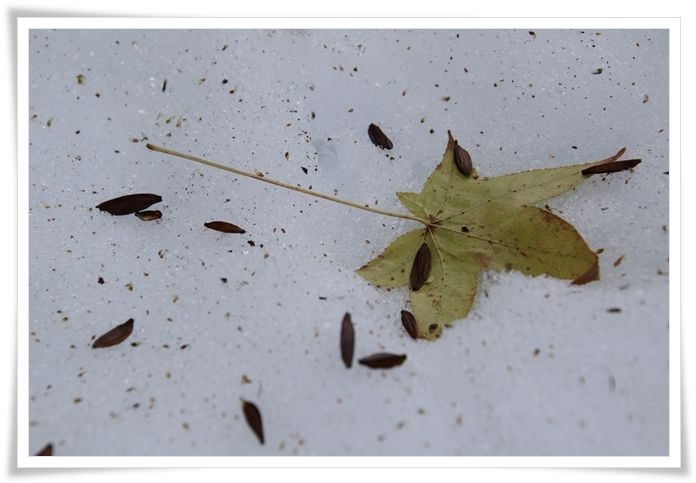 の隅っこのの上の落ち葉は、まだ少し緑色が残ったままの ​アメリカ楓​ です