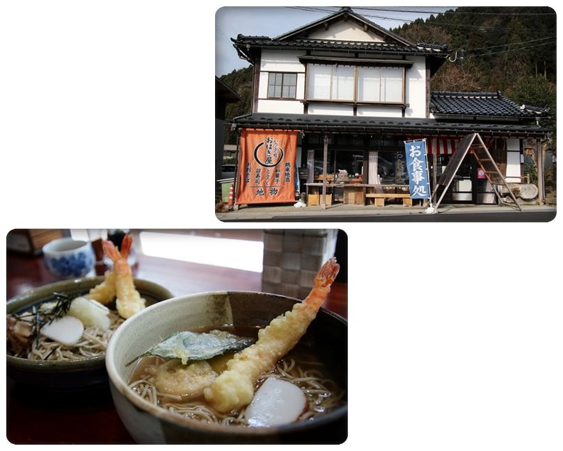 お昼ごはんは 白山比メ神社 の表参道側のに有る おはぎ屋さん で天婦羅蕎麦を