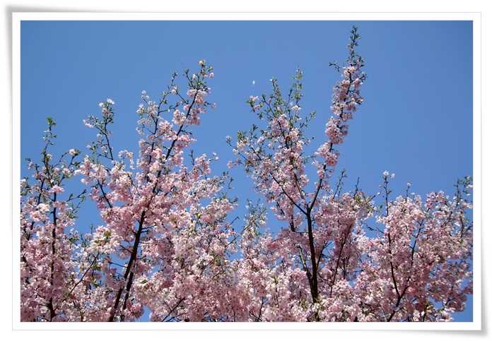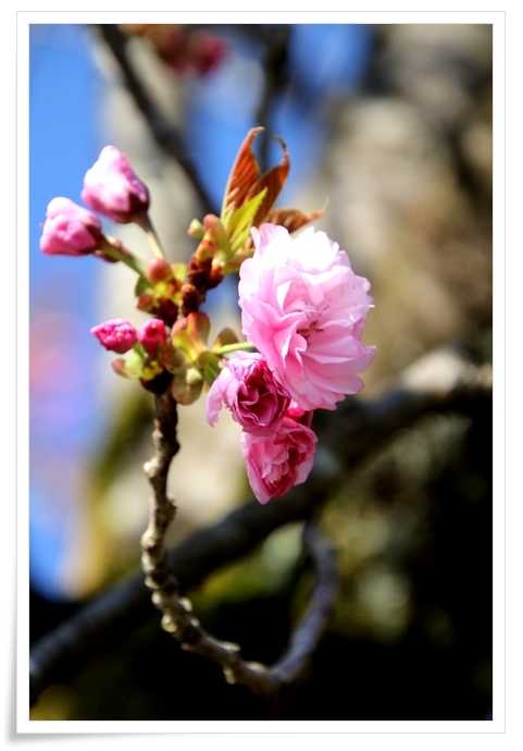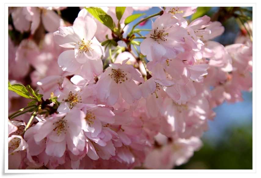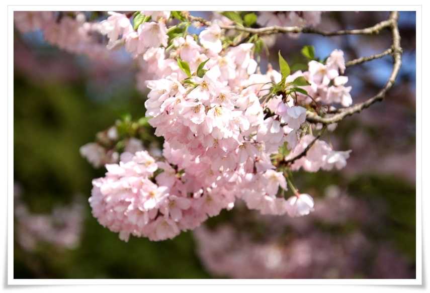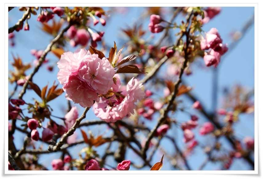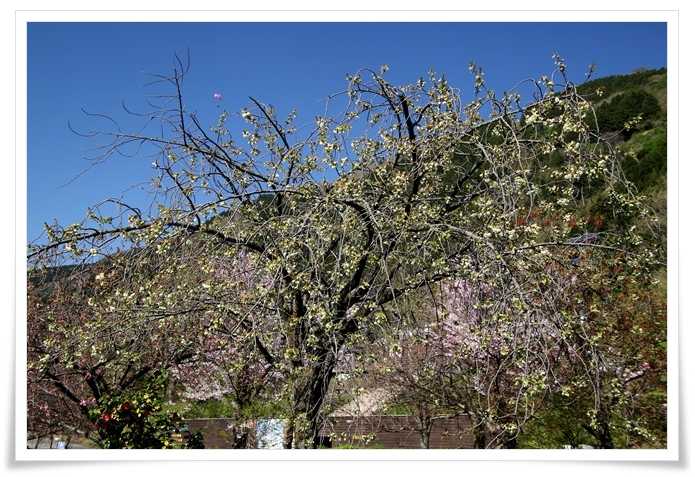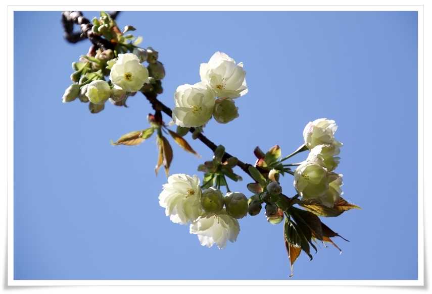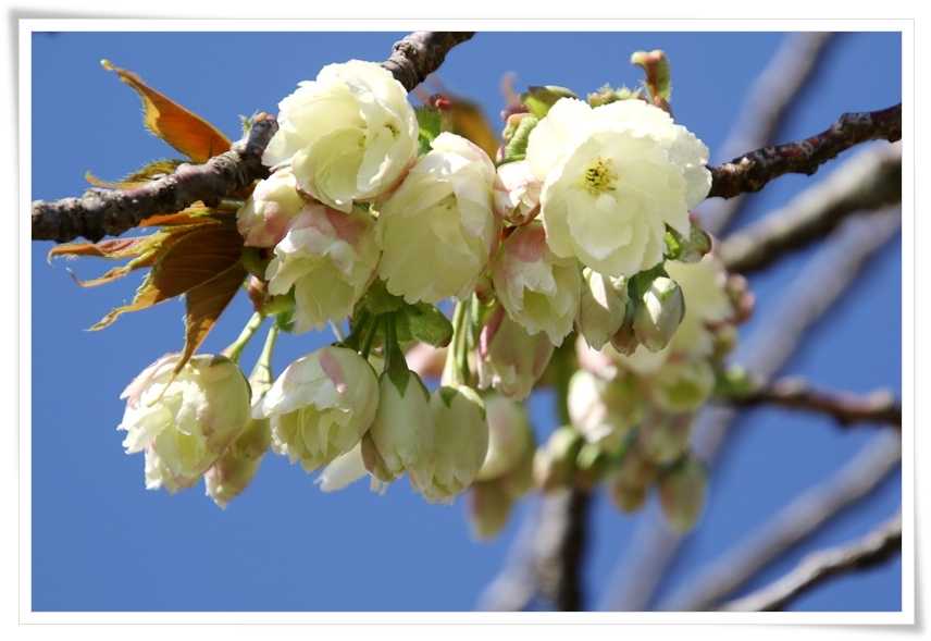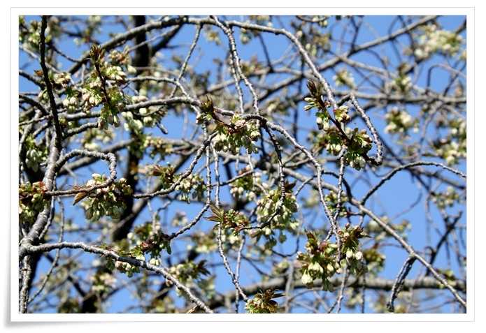 満開を迎えた 思川 の枝先では葉っぱが出始めています