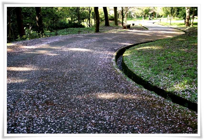 公園の上へと続く急勾配へと続く道も無数の花びらがちりばめられています