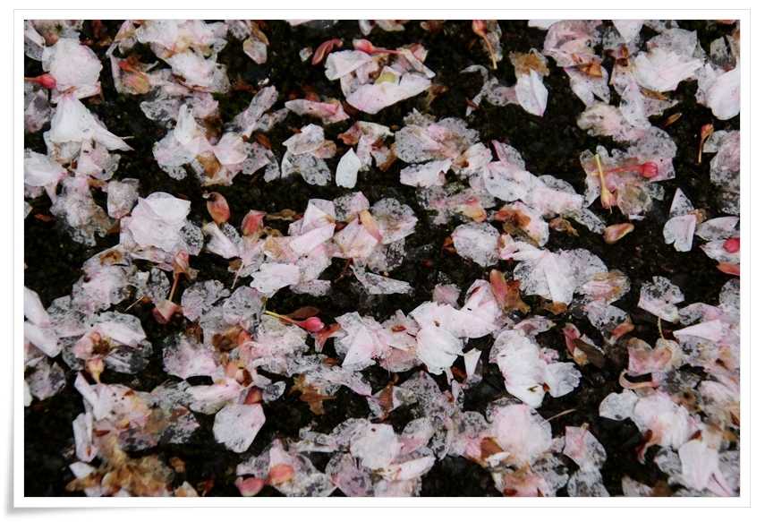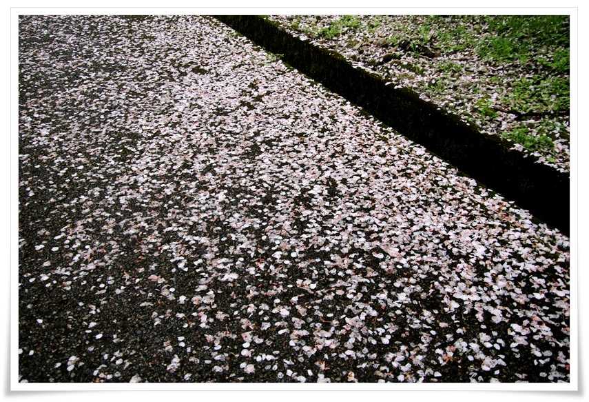 近くの地面の上には無数の散った花びらが作り出す 花莚 が見られます
