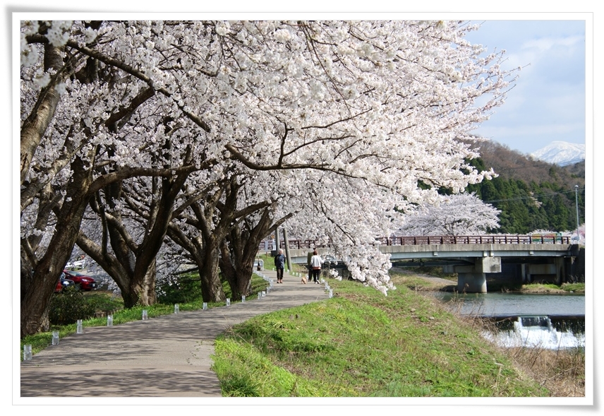 川が大きくカーブしている横に桜並木が続き、遊歩道が作られています