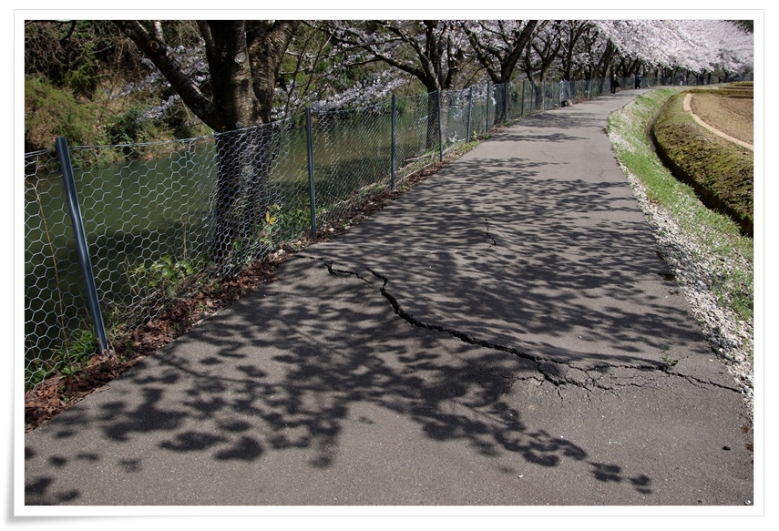 桜の根っこがアスファルトを持ち上げているので、足元注意です