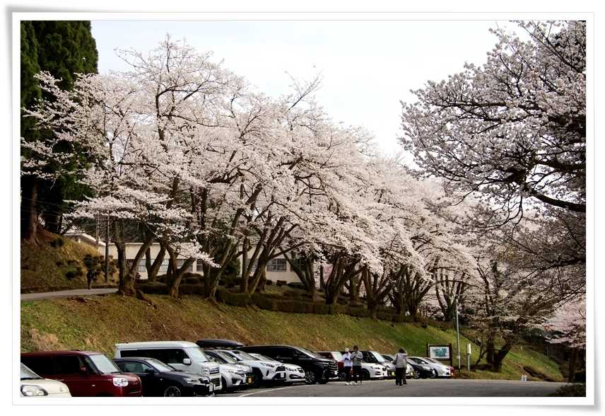 駐車している車や人が小さく写っているのと比べると ソメイヨシノ がどれだけ大きいか分かると思います