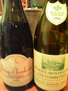 あ~、半端じゃなく忙しいですって、今日はブログ書く暇がありますけどワインもほとんど飲めない日々が続いていますが、the_eaterさんとの飲み会だけはしっかりと今回飲んだのは・・・◇ピュリニーM コンベット 2000 / ジャック・プリュール (右)この前99を飲んで(こちら)、何だか暴れてたので今度は2000こちらはかなり飲み頃でした色は薄目のゴールド。香りは、花とミネラル香の後から甘いハチミツやマロン、そしてコーヒーも味は、99の暴れた感じは無くて熟成感があって美味しい樽や甘味があって結構ボディーも厚くエレガントさはイマイチだけど、自分的には好きなお味余韻も程々あり、美味しかったです2000JPコンベットは ⇒ こちら◆ジュブレ・シャンベルタン スーヴレ 1995 / F・マニアン (ノース・バークレー)10年前に買って大事?に寝かしてあったものパーカーさんが絶賛してたノースバークレーですが、今でもノースバークレーっていうカテゴリーはあるんでしょうか?で、お味の方は・・・縁にオレンジがあるけど、味は結構タンニンがあってまだ熟成途中って感じでも、しっかりした造りでイチゴやベリーがあって美味しいです今でも美味しいですが、あと5~10年するとタンニンが溶け込んで素晴らしい古酒になりそうですで、今宵の2次会は代々木公園の近くの朝までやってるダイニング飲んだのは・・・ドゥーツ(泡)だったと思います (結構酔っ払いでした)(楽天画像)