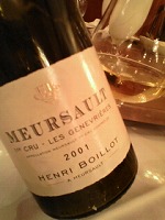 仕事もだいぶ落ち着いてきたので、昨日はお休みを頂きましたで、昼は近所のプールでひと泳ぎでも疲れているのか息が上がって調子はイマイチそして夜は家族を連れて友人と原宿の中華で誕生会誕生会シリーズ第2弾ですまず私はビールで乾杯友人とカミサンは、グラスのスプマンテで乾杯ところがこのスプマンテ、泡が出てない見るからに気が抜けてます友人曰く「完璧にスティルワインになってます」とそれじゃ~、白ワインでもたのみましょうただ普通のドリンクリストには、たいしたワインは載ってないので・・・「すいません、ワインリスト見せて下さい」と言うと・・・イタリアワインしか載ってないリストを持ってきました確かこのお店はフランスワインも置いてあると思ったので、「すいません、フランスワインのリストはありますか」と聞くと・・・出て来ました黒服のソムリエさんとワインリストただ、コピー用紙にプリントしたのをクリップで留めただけの質素な物でもブル白ワインは、フェーヴルのシャブリからLラトゥールのコルシャルまで一通りありましたただ造り手が書いてないものや、途中で切れちゃってるのもありましたで、L・ラトゥールの99コルシャルにしようと思ったのですが、私も友人も以前飲んでるし私の在庫も3本ぐらいあるので却下結局、造り手の名前が「HENRI BO 」としか書いてなかったムルソーにしました◇ムルソー ジュヌヴリエール 2001 / アンリ・ボワイヨで、これがチョイジュクで私好みかなりしょぼいチューリップグラスに注がれたジュヌヴリの色は、綺麗な黄金色香りは甘い花とカスタードが綺麗に上がって、マロンやバニラも感じられてかなり良いです味は01のせいか、やや線が細いけどムルソーらしくマッタリして酸も乗ってて美味しいでもこのぐらいの方が夏には良いかもちょうど良い熟成感で、とにかく香りで酔える素晴らしいワインでしたもう少ししっかりしたグラスで飲んだら、もっと美味しくなってたかもそれにしても01のアンリ・ボワイヨ、良かったですよ楽天で探すと01のジュヌヴリは無いですね。。。 ⇒ こちらって、05&06なんてレストランで飲むより高いじゃんで、2次会はまたまたコリン星へところが、入ろうとするとマネージャーさんがいて「土曜は10時からなんです」とって、時計を見るとまだ9時土曜のコリン星は10時からでした仕方ないので、急遽赤坂へで、またまたハジケテしまい、日付が変わる間際まで歌い踊ってしまいました