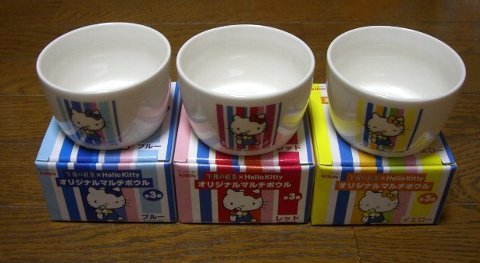 午後の紅茶の500mlPET4本か、1.5LPET2本購入すると「午後の紅茶×Hello Kitty オリジナルマルチボウル」がもらえました。レッド・ブルー・イエローの全3種類。かわいいし、使えそうなので全種類ゲットしました。絵柄も微妙に違います。キティの目が開いてる、片方閉じている、両方閉じている。目が違うだけなのに表情が全然変わるんですね。
