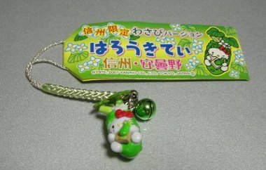 ご当地キティの根付「信州限定 信州・安曇野わさびバージョン」わさびとおろし金を持ってます。辛くて涙するキティ、かわいい~。 信州限定 安曇野わさびキティ根付