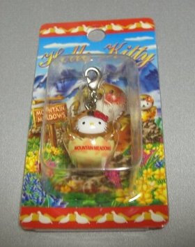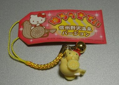ご当地キティの根付「信州限定 信州野沢温泉バージョン」民芸品の鳩車に乗ったキティです。