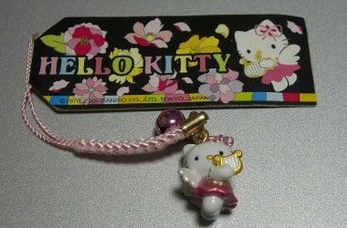 限定キティの根付「花とエンジェルキティ ピンク」天使の羽がはえたキティ、竪琴を持ってます。どんな音色を奏でるのかな~。 花とエンジェルキティ根付(ピンク)