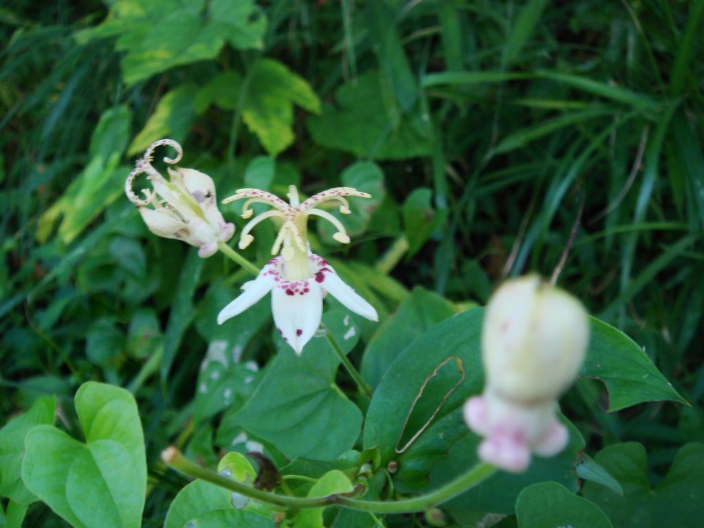 先週の写真ですが 四季の森公園で ヤマホトトギス咲いてました。たぶん ここは ヤマジノホトトギス2割 ヤマホトトギス5割両方の特徴を持つ混血と思われるのが3割くらい 咲いてます。下の花弁が反ってるのがヤマ水平なのが ヤマジノ もしくは咲きたてのヤマ あとは茎の分岐などから判別するそうです。