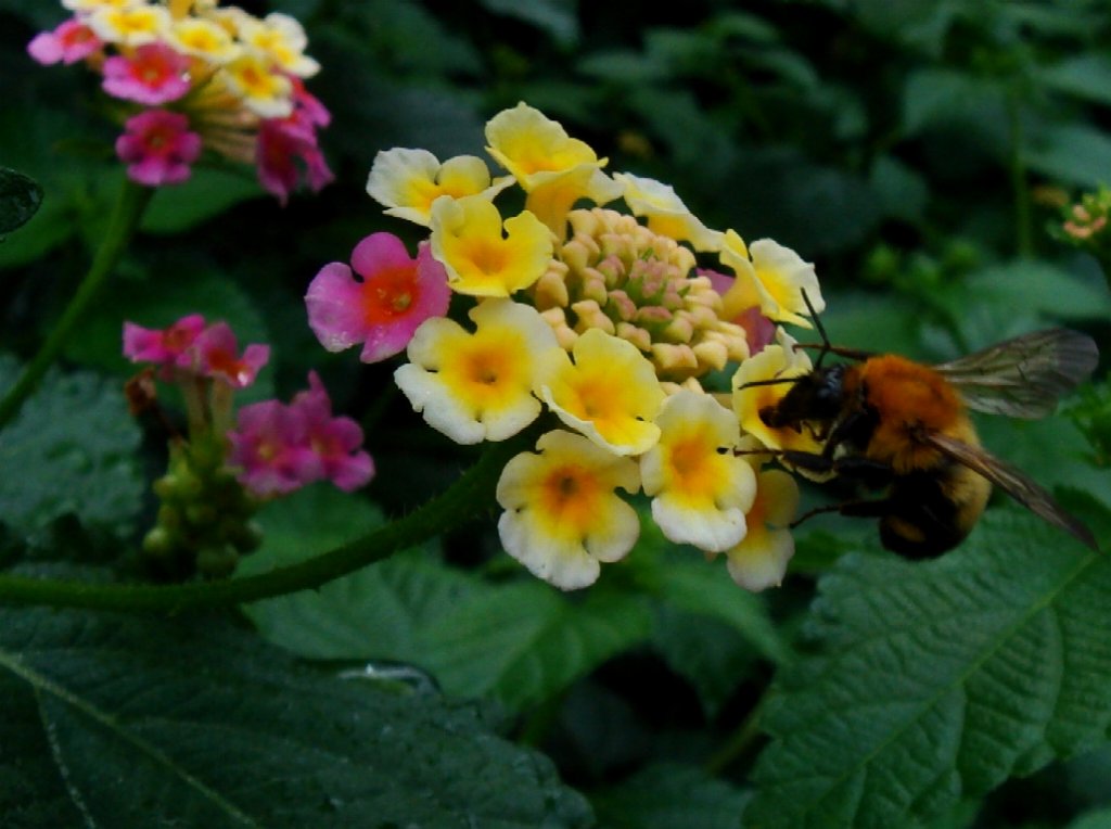 ランタナ 咲き始めは黄色で 後にピンクに変わります。なかなか見飽きない花です。水道道のどうろ端で・・・。