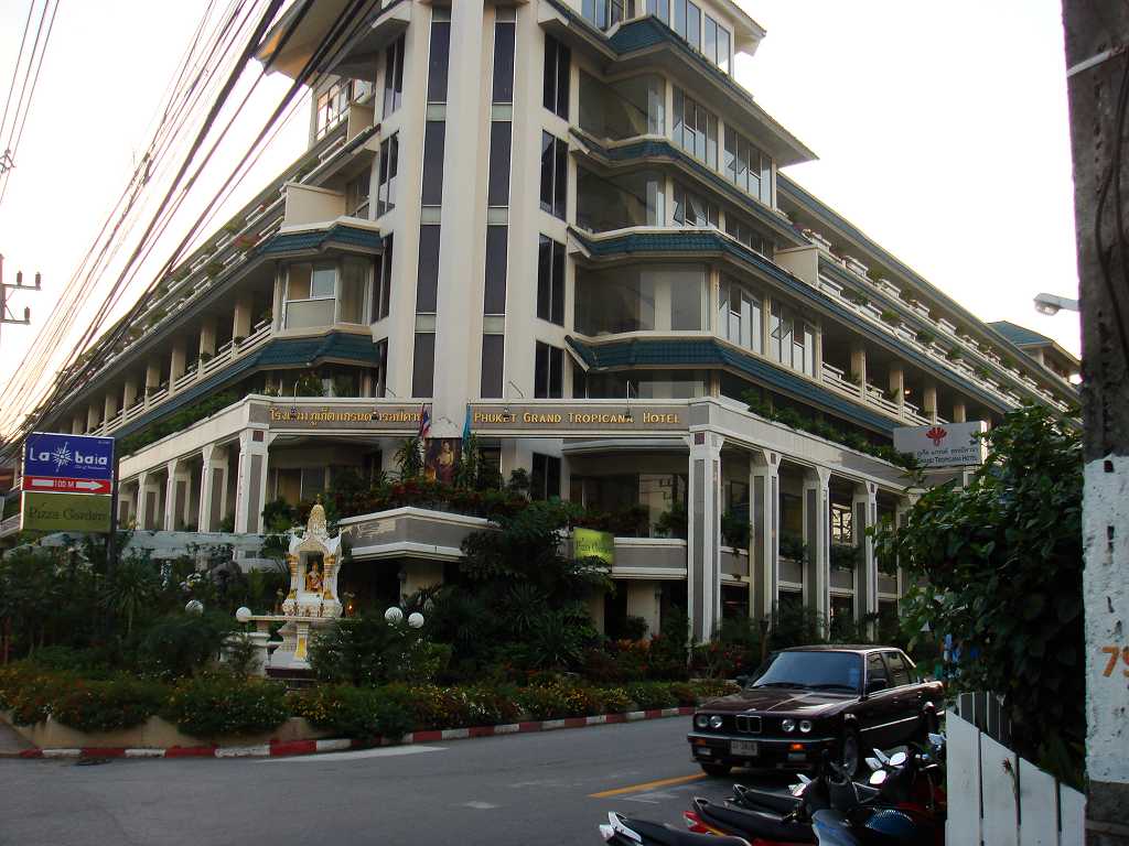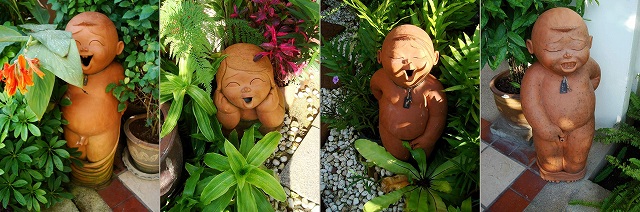 ホテルの庭にいた ローカル小便小僧と小便小娘10/16 出発今日は 自分でも あきれかえるほど おばかでした・・・。(T_T)1時位から起きてたものの、掘り出した漫画とか見つつ、だらだらと荷造りしてる間にあらもう6時。慌てて京急に乗って 横浜6時20分着成田エクスプレスは 横浜6時26分発普通ならぎりぎり間に合う はずだったのだが・・・・。(^o^;)ヾ何をとち狂ったか、東海道ホームへ 駆け上がって見渡せば右も左も両サイド、熱海・沼津方面・・・ 両方下りや~ん。慌てて 隣の東海道線の上りホームへ 間に合ったぁ~ とダイビングバックの上ににへなへなと崩れかけたらなんと、成田エクスプレスは もう一本隣のホームにするすると入ってたのだった。ぐわわぁん、 ええぇ~ いつの間に東海道線じゃなくなったんだっけぇ~・・・日ごろの運動不足もたたり、ひざはガクガク大笑い、3度目のホームの階段を斜めになっての昇り降り・・・応えたぁ~。 もう 息も絶え絶えになりながらホームを登ったら成田エクスプレスは、まだ停まってました。やった 間に合ったぁ・・・。その時、構内アナウンスが「ただいま車内清掃中です しばらくお待ち下さい。」と、あったので 列の後ろで、ぜいはーぜいはー 息を整えて待っていたら「それでは発車します。」 ぷしゅ~~と無情にドアの閉じる音。あれま~~ ・・・ ホームに間に合いながら お見送りしちゃったよ~。動かない列の人達は 清掃を待ってたのでなくて 次の電車を待ってたのでしたぁ。一分ほど 石化してました。追いかけて ヨコハマ~ エクスプレスが 逃げる~。ええと 誰の歌だっけ? 気を取り直して、湘南ライナーで大崎まで、在来線で品川へ次のエクスプレスか京急か模索して、凄く時間のロスしてしまい、結局京急のスカイライナーを選び 品川から乗ろうとしたら駅員さんに 「JRで日暮里まで行った方が早い」とアドバイスされ ふたたび山手線で日暮里へ。8:00集合で まだ日暮里。こりゃ全キャンセルかな~と あきらめつつ 代理店に電話をかけたら「まだ間に合うから 急いで来い」とのこと。8:03分発の成田スカイライナーで 9:04分(実際は7分着)セキュリティチェックを受け、4階に着いたら もう9:20チェックインしてダイビングバックを預け、搭乗開始は9:30分なのに、まだイミグレーションのゲートの前。冷や汗たらたらでしたが、9:45に搭乗し、10:00のフライトに何とか間に合いました。飛行機に乗ってからは さしたる出来事もなく 16:30(タイ2:30)頃バンコク着。 2階に到着し、そのままプーケット・トランジットへ。バンコクを約18:00(タイ16:00)に出発し一路プーケットへ。地上は 薄く幕がかかったように、もやっと煙ってて 高温多湿なんだなぁ、と 改めて実感しました。プーケットには20:00(タイ18:00)着でした。プーケット島は 青い海にたくさんの島々がちりばめられた つくもの島々でした。空港に出迎えてくれたのは JTBの現地ガイドのチャィさんでした。40分ぐらいで パトンビーチの グランドトロピカーナホテルへ到着。ここで 予想外のトラブルが・・・。もらったキーでドアは開くものの、電気がつかない。私も呆然としてましたが、荷物を運んで部屋に案内したポーターも一緒に呆然としてるのであった・・・。 真っ暗な部屋の中で、私が何度か ”CALL TO THE FRONT!!”ってようやく連絡したものの 4~5分経っても音沙汰なし、全然対応が悪いんで 降りて直接フロントへ。しばらくフロント先で 待たされて、また 、部屋に戻って待っててくれとのこと。スタッフが来たかと思えば、真っ暗な部屋に 独り・・・ おいおい・・・。結局、荷物全部引き上げて 再度フロントへ行って ”ROOM CHANGE OK?!”かなり強い口調で交渉し、部屋換えしてもらったものの・・・ ポーターはさっきの部屋でチップを上げたら さっさといなくなってしまい、今度は部屋番便りに 荷物抱えてひとりで部屋探し。 チップの中身が部屋案内も含まれるとしたら、チップ渡すのが 早かったみたいかな。結局、かなり入り組んだ奥でエレベーターから、一番遠い部屋になってしまったのでした。後で知ったのだが、無料のミネラルウォーターが 本来なら用意されてるはずでしたが、無かったので、冷蔵庫のミネラルウォーターを飲んだところ、なんと80B(240円)もチェックアウト時に請求される羽目になるとは・・・ この時点でまだ知る由もなかったのでした。国際電話の掛け方はあるものの市内外線の掛け方がどこにも説明が無く、フロントに掛け方を聞いて 9-局番と 掛け方を聞いたのにそのとおりにしても、まったくつながらず(多分この部屋は内線のみ?) 結局フロントから電話を掛けてもらう羽目になりました。マリンクエストにようやくつながり 明日のピックアップの予約して 本日終了。何度もフロンと参りしたおかげで、フロントの女の子からはVIPと あだ名がつけられてしまいました。朝から晩まで、 つ、つかれたぁ~~・・・・・。泥のように 爆睡したのでした。