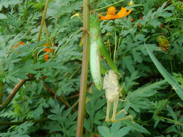 早いですね~ もう10月なっちゃいました~。バッタの世界でも 衣替えのようでしたよ。「虫さんの世界の景気は どうでっか?」「・・・ヨコバイだす。」ヨコバイは 日本では害虫だけど 中国では東方美人茶をつくるのにかかせない虫なんだと私の暮らしは 風船カズラのように 風に吹かれて ぶ~らぶ~ら