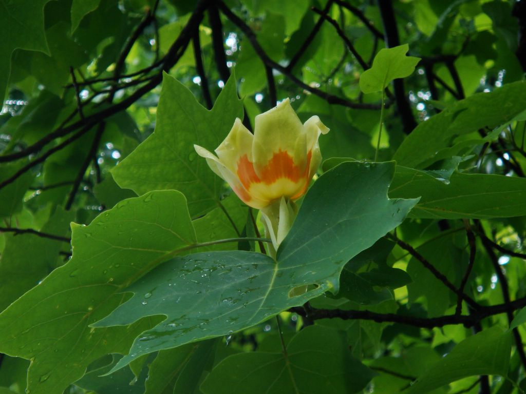 ようやく ユリノキの花 見れました(*^ワ^*)頭上に咲くチューリップです。で、チューリップツリーとも呼ばれます。葉っぱが、まるで緑のTシャツの吊るし売り状態。ハンテンボク(半纏木)の別名もあります。万騎が原こども自然公園にて