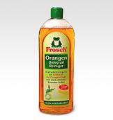 カエルマークのFrosch(フロッシュ)が気になっていました。最近雑貨屋さんなんかでよく見かけるドイツ製の洗剤です。一つが900円ほどするので購入など考えたことはありませんでした。でも商品のことを知ると「今使ってる洗剤はダメダメじゃん!」と思うようになり、それらが無くなり次第、洗剤類全てをフロッシュに変えていこう!と思うようになりました。「カエルの住める水辺を」テーマにこのフロッシュシリーズが誕生しました。世界が認めるOECD(経済開発協力機構)のテストで、排水されてから19日以内に有効成分のうち98%が生分解して自然に還るということが証明されているのです! 今私たちが普通に使っている洗剤は分解されずに残ってしまいます。これじゃ~地球にやさしくない!!じゃぁ地球にやさしい洗剤を使っていこう!ということで、まずはお風呂洗剤から購入です。オレンジマルチクリーナー!使用するのに適するところは、床、窓ガラス、浴槽、タイル、トイレ、シンクです。わたしはこれをお風呂場の洗剤として利用します。原液をこのスプレーボトルに入れ10倍以上に薄めてから使用するので、実際はクリーナー900円というのは安いのではないか?と思われます。次に狙うのは食器用洗剤です。地球にやさしく行きたいな。