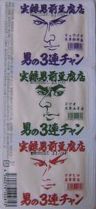 男は男でも、男前豆腐のことです。わたしはあまり豆腐は好きではないので冷奴はめったに食べません。なので豆腐を買うときは、鍋とかマーボー豆腐、ゴーヤチャンプル等を作るときぐらいかな。そのままで食べるのがなんか味気ないというかなんというか。だからそのまま食べられるのが、ゴマ豆腐やたまご豆腐ぐらい。ほんとにたまに冷奴するけど、それも結構嫌々なんです。それがこないだ友達と買い物していたらこの「男の3連チャン」が128円だったしこれは冷奴で食べるとおいしいとの評判だったので買ってみました。5cmほどのサイズで小ぶりタイプ。プリンのように取り出すと、豆腐の背中?には「男」という文字が浮かび上がります。食べてみるとすごく濃厚で噂どおりおいしいです!これなら何も加工しないで冷奴のまま食べられます。あと残っているのは「リュウイチ」まっ、もう食べた「テツオ」も「マサヒロ」も同じ味なんだけどね。