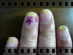 先月初めてジェルネイルをやってもらってすごくキラキラしてかわいいのに普通のマニキュアのようにかなり置いても寄れることなく、すぐに出来上がってそれが1ヶ月も持つからかなり感動したので自分でUVライトのジェルネイルセットを買っちゃいましたこのセットにクリアジェルとキラキラのラメやシェル、それに押し花までいろんな種類がついてたからどんなデザインにしようか悩みました記念すべき初セルフジェルネイルはコレ!黄色のラメを爪先にたっぷり置いて左薬指と右親指にピンクの押し花(本物!)をつけたよ。