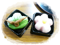京菓子(お茶菓子)作りの体験へ行ってきました。先生の指導のもと、見本を見ながら2種類作ります。1つは少し簡単な「梅の花」もう一つは「雪かぶりの松」です簡単といわれた梅の花。これも結構難しかったです。うっすらピンクかかってるのわかるかな?これは内側にピンク、外側に白の生地を使ってて白の生地の伸び具合で色を調整します。難しい方の松は、雪と松の境目を作るのはそんなに難しくはなかったけど形を整えるのが大変でしたでも写真では上手にみえるでしょっあとで先生のデモンストレーションがあってそこで作ってくれたのがコレ↓みかん!すごぉ~いさすがプロわざ!ここはすごくリーズナブルでしたよ。見本の京菓子2個、自作2個。現地でいただくお茶菓子1個&お抹茶。1グループに1枚だけど、写真つき修了書がもらえてなんと、1890円でした!安っ