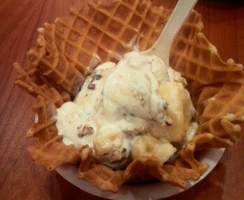 ちょい前はやってた、コールド・ストーン・クリーマリー大理石の上で、いろんなトッピングとアイスクリームをこねこねしながら、歌ったりとパフォーマンスを披露してくれるんです。でもね、歌ってとリクエストしなければダメみたい。バナナ失敗!!お願いするの忘れた他の方のお願いにとを傾けご満悦モンキー・バイツバナナアイスクリーム・バナナ・クランチバー・ピーカンナッツ・ピスタチオ(実際はココナッツなんだけど、変更してもらっちゃった) ホット メルティン ワッフルバナナ アンド チョコレート(ワッフル その場で焼いてくれます。ホカホカ)仙台にあると事前にリサーチしお出かけしました 調べることはいいことだと自己満足 とりあえず一つ目の任務完了