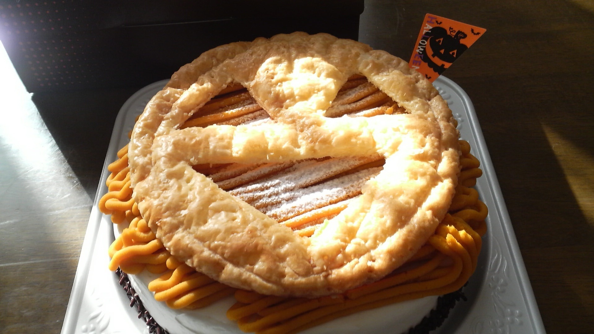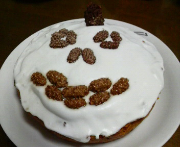ハロウィンの日 ”パンプキンケーキ”をつくりました。かなり適当なレシピ予定では、パイ生地を使ってと思いましたがとりやめ下の土台の生地をビスケットを利用して、タルトもどき風にしてかぼちゃをつぶして中へポイオーブンで焼けば、はい出来上がり上にクリームをかけ顔をつければ仕上がり見た目いまいち、食べたら、んーーー パンプキン?じゃなくてかぼちゃケーキ類は、材料の分量が大切です。みにしみます。