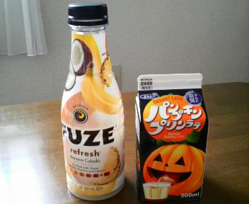 FUZEフルーツドリンク バナナとパインとココナッツドリンク 乳酸菌飲料の味ですね。好きな味 先日の三沢基地航空祭で購入しました。どっかで売ってないかしら?パンプキンプリンラテ プリンがドリンクになっちゃった。パンプキンの味が薄すぎてわかんない。プリンをぐちゃ ぐちゃに混ぜて水で薄めたみたいな味です。一気飲みしちゃいました。ローソンにて購入。 新作が気になります。つい手が出る変わった飲み物達。やめられません