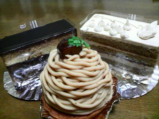 相方がケーキ屋さんを発見してきました。即、購入 敏速がモットーです。モンブラン・ショコラ・コーヒー味のケーキ(名前なんだったかな?)けっこう甘め昔懐かしーーー味がして、間違ってたらごめんなさい。バタークリームな気がします。途中でギブ 相方ががんばりました。