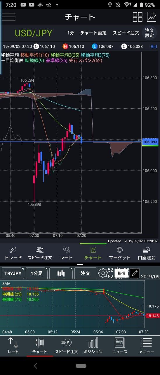 おはようございます。今週も取引が開始しましたね。米国の中国に対する貿易関税が予定通り実施されましたので、きっと立ち上がりは大きく値を下げるであろうと多くの方が予測したのではないでしょうか?ドル円は40pips近くトルコリラは10pips近く値を下げてのスタートです。とりあえずこのチャンスにドル円を20Lot購入し、トルコリラは10Lotほど入れ替えを行いました。変えたタイミングは狙い通り、あとは素人の読みがどこまで的中するか!ドル円の目標は106.700円!ここまで来たら一気に利確です!!