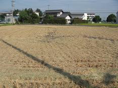 安曇野で稲刈りが始まったというニュースは、しばらく前に聞いていましたが、近くの田んぼでも、刈り取りされていました。場所は、前に稲穂の画像を紹介したところです。やっぱり、早かったんです。刈り取られた田んぼの周りは、ワラの香りに包まれていました。