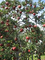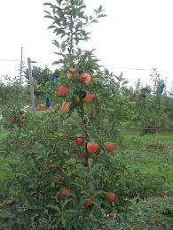 『 秋 映 』のご紹介を(^。^)これも、長野県で開発された品種です。「千秋」×「つがる」の交配で生まれた品種です。σ(・_・)が感じた特徴が2つあります。ひとつは、色。画像でみれば、すでに収穫ができそうなくらい、真っ赤になっていますが、これでも、中は熟していないため、まだまだ、2週間くらいは待つそうです。そのため、収穫時期では赤みがかなり濃くなるそうです。さらに、放っておくと黒味がかってくるそうです(~_~;)2つ目は、果点(かてん)がはっきりしていること。普段はあまり気にしないかもしれませんが、りんごには、果点と呼ばれる、黄色い点が、表面にはいくつかあります。多いと、甘いとか、少ないと、甘いとかはないと思います。味は、まだ収穫適期でないので、コメントできませんが、美味しいことに間違いはないでしょう。