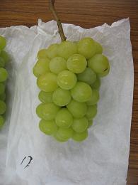 JA松本ハイランド管内の、大村農園で育成された品種『黄華』です。色は、もう少し黄色くなります。これも、以前書いた『ナガノパープル』同様、皮ごと食べられる、ぶどうです。育成されてから20年以上経つそうですが、ようやく、栽培面積を増やしていき、生産拡大を図っていくようです。糖度は18ぐらいで、パープルよりは低めですが、マスカットのような香りと、さっぱりとした味わいが何とも言えません(*^。^*)現在は、一般のスーパーなどにはまだまだ、出ていないようです。なんせ、珍しいのと美味しいので、結構なお値段にもなっています(^^ゞ検査のためなので、数粒食べさせてもらいましたが、そうでもしないと、σ(・_・)の口には入らなかったことでしょう。