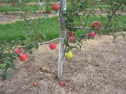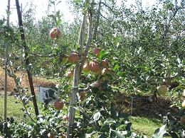 赤い実の中に、黄色い実がひとつ。なにやら不思議な木ですが、別に、病気でも突然変異でもありません(^。^)これは、「接木(つぎき)」をしているんです。園芸をやっている方には、なじみだと思いますが、野菜苗や果樹の苗に多く使われています。意外に知られていないと思いますが、果樹園でもよい品種への改植は、樹を引き抜いて、新しい苗を植える方法もあれば、「高接(たかつぎ)」といって、今ある木の枝に、新しい品種の枝を接いで、樹全体の枝を変えてしまう方法もあります。このほうが、少ない年数で多くの実が取れるようになるんですね(*^。^*)黄色い実「シナノゴールド」は別の機会に・・・