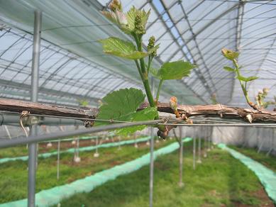 松本市山辺のブドウハウスの中。既に葉が開いていますハウスの中は30度近くあります(*^。^*)
