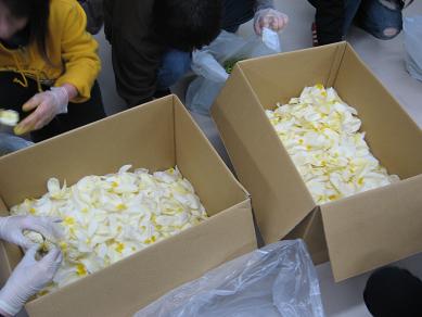 昨日、聖火リレーを観終わってから、もんぜんプラザ8Fに行きました。5月3日から始まる『善光寺花回廊』のプレイベントとして、プレ作品を作りました。まずは、富山から運ばれたチューリップの花びらのもぎ取りです。花の中に指を突っ込んで、開くようにすると、案外簡単に花びらがもげます。雨が心配されましたが、3時頃には上がりかけTOIGO前に移り、プレ作品を作ることが出来ました。作り始めて、はじめは簡単と思っていましたが、表面の花びらを綺麗に並べるのは、手間がかかりますね(^^ゞ座っての作業なので、膝と腰が辛いですね。