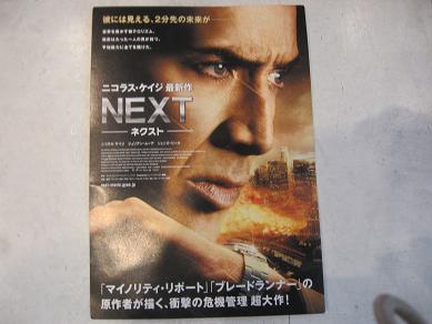 試写会に当たり、今夜行ってきました。『NEXT-ネクスト-』主演:ニコラス・ケイジストーリーは書きませんが、上映時間が1時間40分ぐらいで、意外に短かったです。いつも思うのですが、ニコラス・ケイジって、映画の始まった時にはぜんぜんかっこよく見えないのに、終了間近には、かっこよく見えるんですよね。不思議です。松本でも試写会は何回か行きましたが、長野のほうが回数が多くあるので、どんどん応募したいですね。