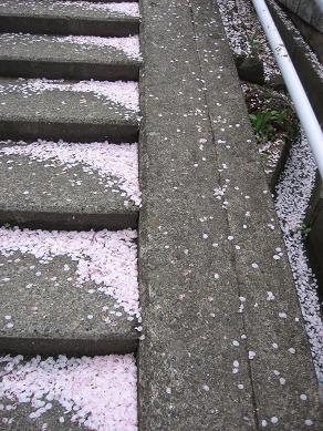 昨日の風で、桜の花が多く散ってしまいましたね(*^。^*)城山動物園に登る階段に、花びらがかたまっていました。城山公園のそばでは、花満開ですね。