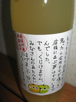 今年の夏過ぎ、下伊那の地区で雹が降りました。そのために、収穫間際の梨に被害が出ました。何とか被害農家を救おうとジュースが造られました。それがこのジュースです。微弱ながらのご協力です。