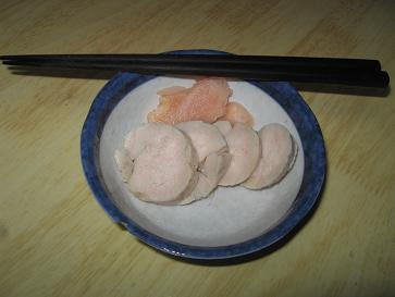 『新ショウガの甘酢漬け』以前から、作ってみたかったので、今回初挑戦してみました。新ショウガ 230g塩 少々[甘酢]酢 130ml砂糖 1/4カップ塩 ちょっと(1)新ショウガを、はかまや皮の硬い部分を、爪でこそげ取り、 繊維に沿って薄く切り、5分くらい水にさらした後、 水気を切る。(2)鍋に甘酢の材料を合わせて火にかけ、 砂糖が溶けたら火を止めて冷ます。(3)鍋にたっぷりの湯を沸かし、 水気をきった(1)を入れ、 再び沸騰してきたらザルに取って広げ、 塩少々をふって冷ます。(4)清潔な容器に(3)を入れ、(2)を注ぐ。 半日ほどおくと食べられるそうです。 ピンク色は勝手に付くんですね(*^。^*)うーーん。食べるラー油に続き、おつまみが増えていきます(*^。^*)